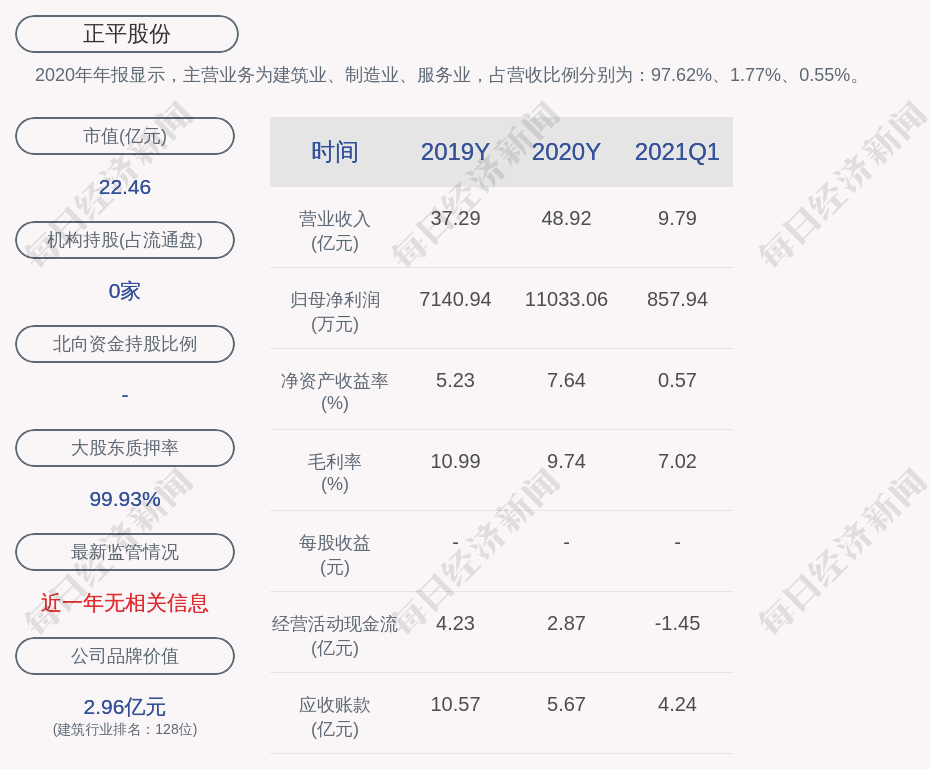 2020年年报显示,正平股份的主营业务为建筑业、制造业、服务业,占营收比例分别为:97.62%、1.77%、0.55%。