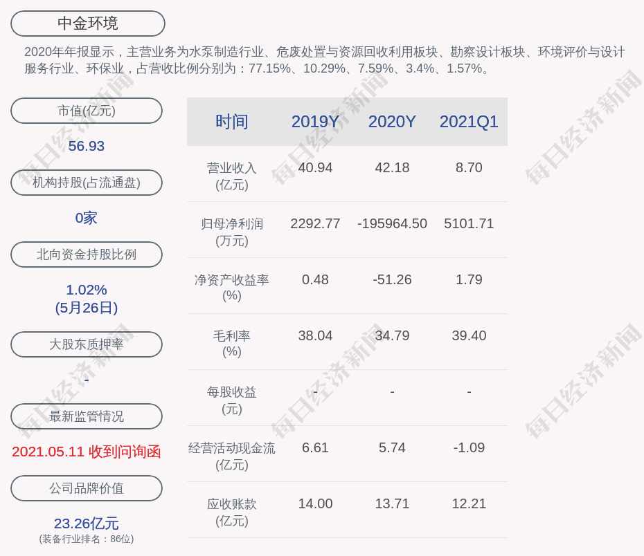 2020年年报显示,中金环境的主营业务为水泵制造行业、危废处置与资源回收利用板块、勘察设计板块、环境评价与设计服务行业、环保业,占营收比例分别为:77.15%、10.29%、7.59%、3.4%、1.57%。