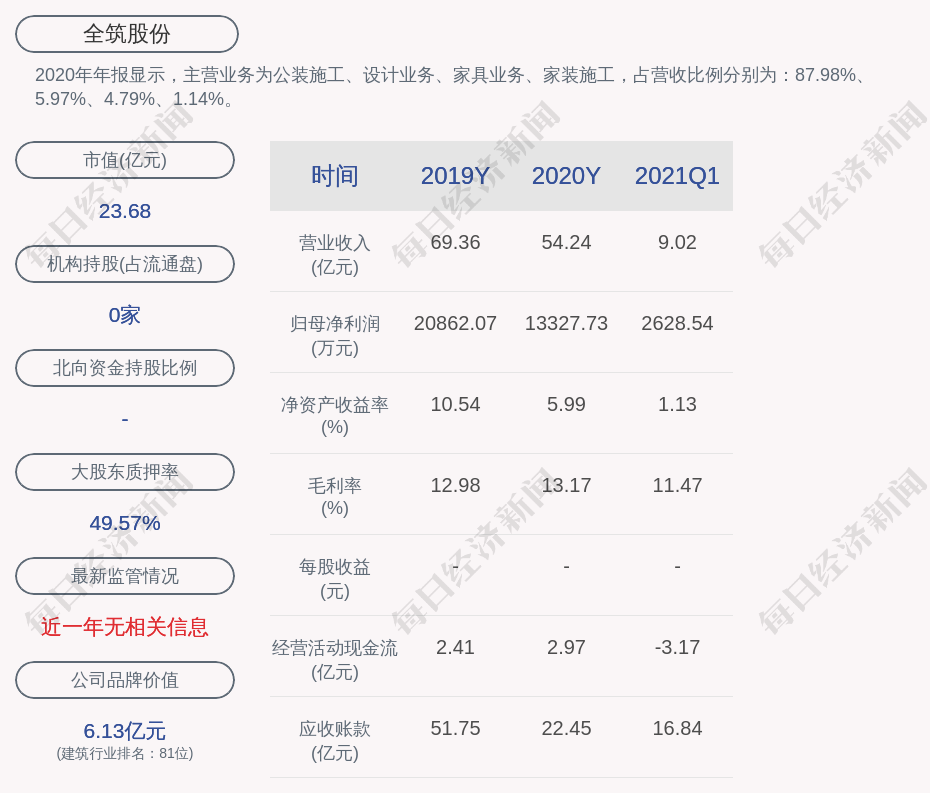 2020年年报显示,全筑股份的主营业务为公装施工、设计业务、家具业务、家装施工,占营收比例分别为:87.98%、5.97%、4.79%、1.14%。