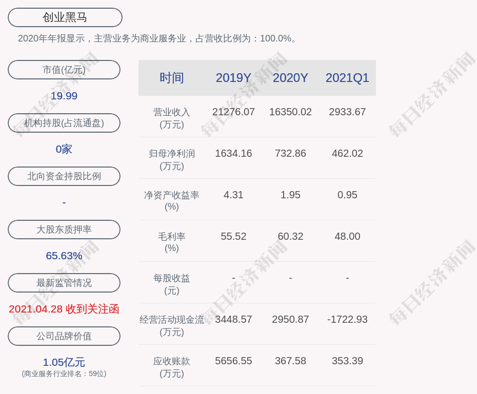 2020年年报显示,创业黑马的主营业务为商业服务业。