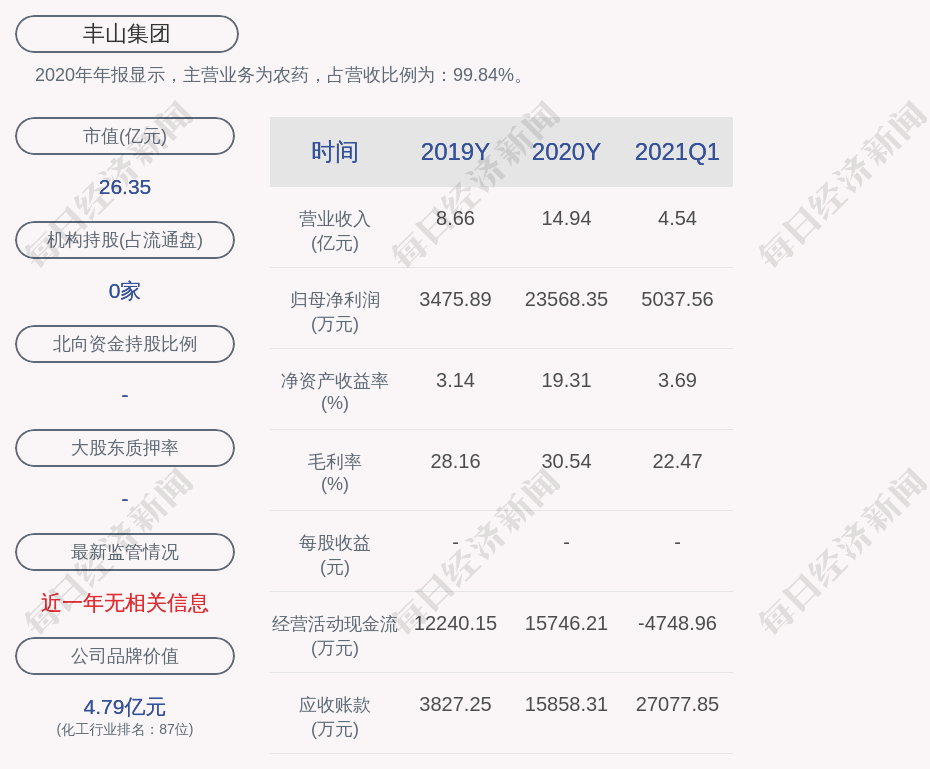 2020年年报显示,丰山集团的主营业务为农药,占营收比例为:99.84%。