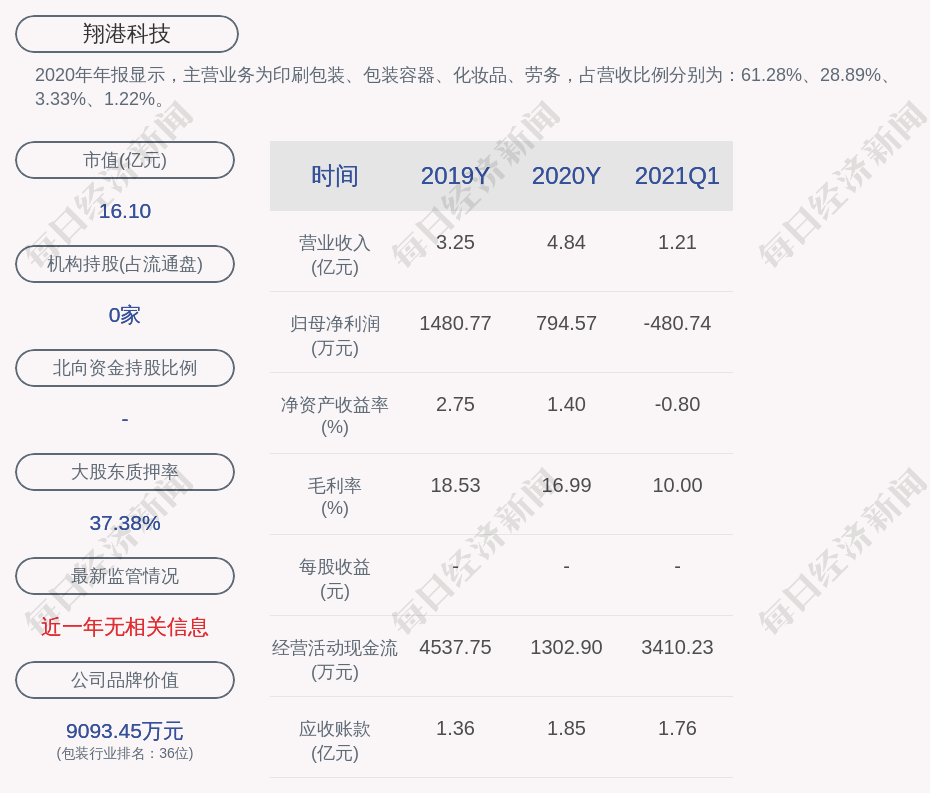 2020年年报显示,翔港科技的主营业务为印刷包装、包装容器、化妆品、劳务,占营收比例分别为:61.28%、28.89%、3.33%、1.22%。