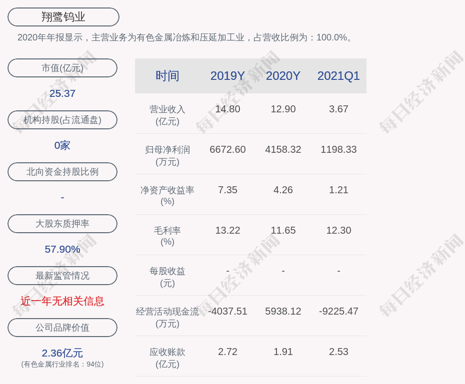 2020年年报显示,翔鹭钨业的主营业务为有色金属冶炼和压延加工业,占营收比例为:100.0%。
