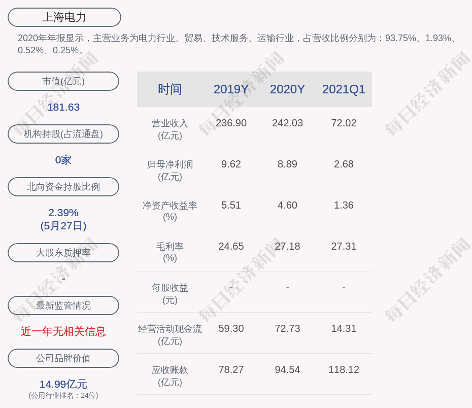 2020年年报显示,上海电力的主营业务为电力行业、贸易、技术服务、运输行业,占营收比例分别为:93.75%、1.93%、0.52%、0.25%。