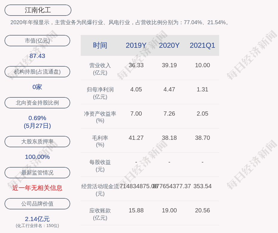 2020年年报显示,江南化工的主营业务为民爆行业、风电行业,占营收比例分别为:77.04%、21.54%。