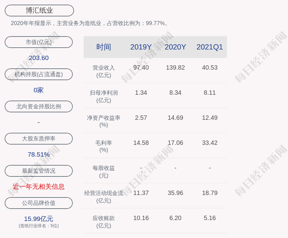 2020年年报显示,博汇纸业的主营业务为造纸业,占营收比例为:99.77%。