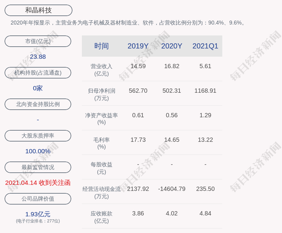 2020年年报显示,和晶科技的主营业务为电子机械及器材制造业、软件,占营收比例分别为:90.4%、9.6%。