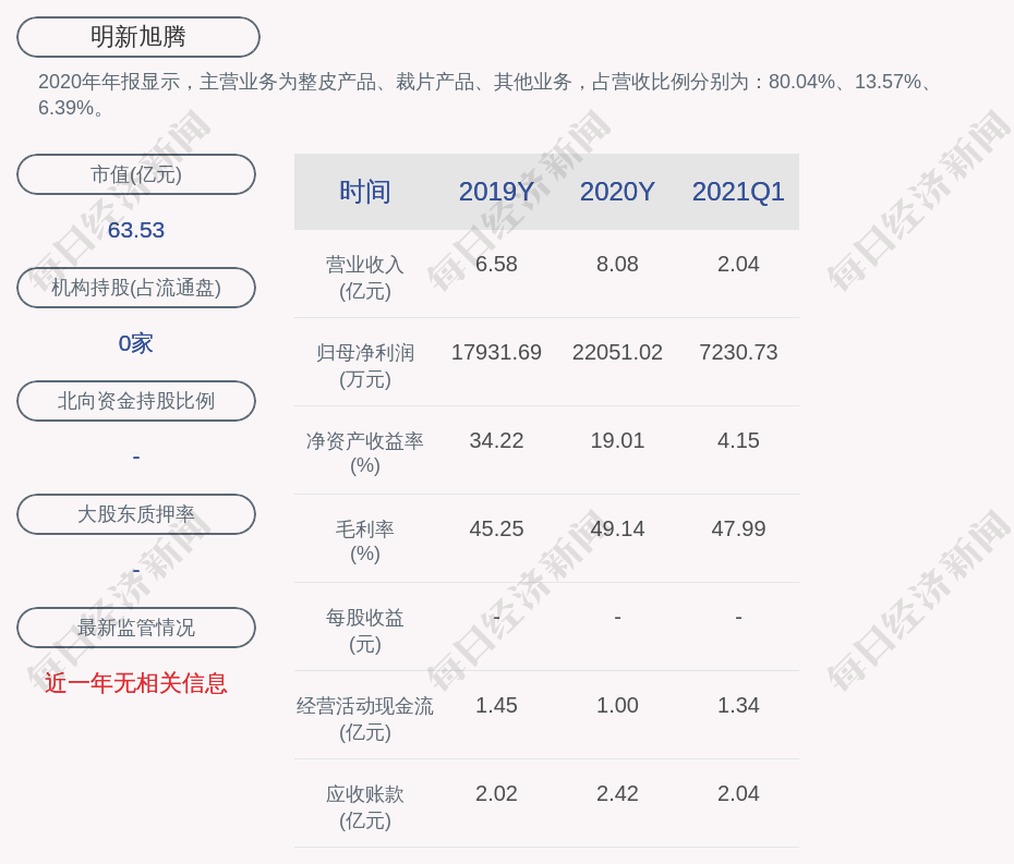 2020年年报显示,明新旭腾的主营业务为整皮产品、裁片产品、其他业务,占营收比例分别为:80.04%、13.57%、6.39%。