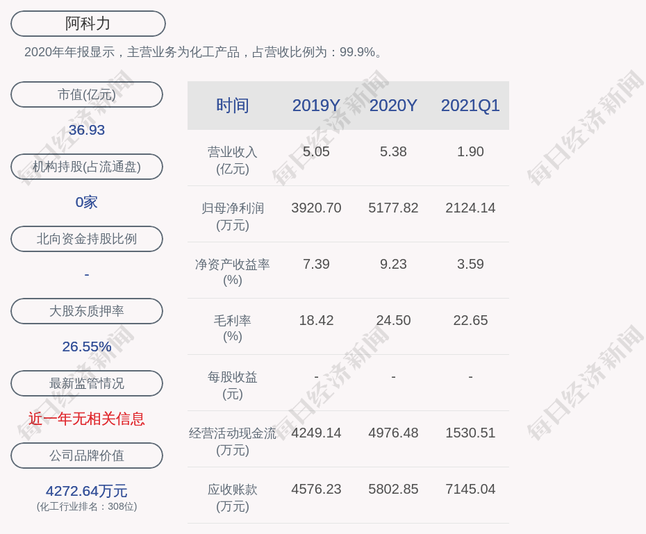 2020年年报显示,阿科力的主营业务为化工产品,占营收比例为:99.9%。