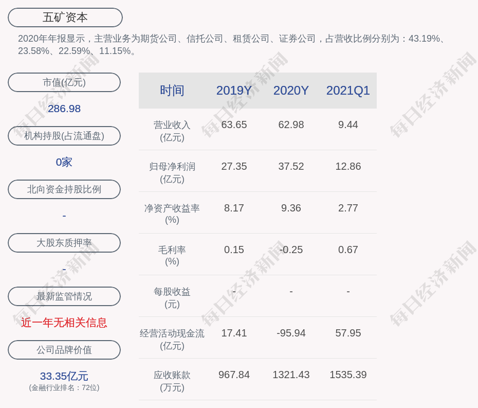 2020年年报显示,五矿资本的主营业务为期货公司、信托公司、租赁公司、证券公司,占营收比例分别为:43.19%、23.58%、22.59%、11.15%。