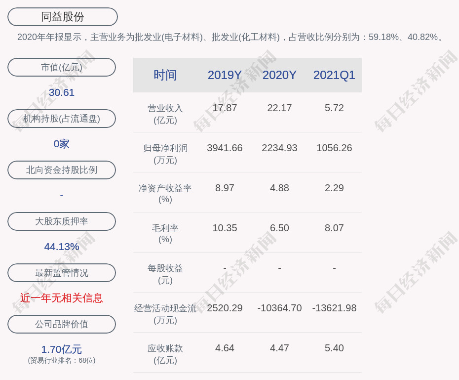 2020年年报显示,同益股份的主营业务为批发业(电子材料)、批发业(化工材料),占营收比例分别为:59.18%、40.82%。