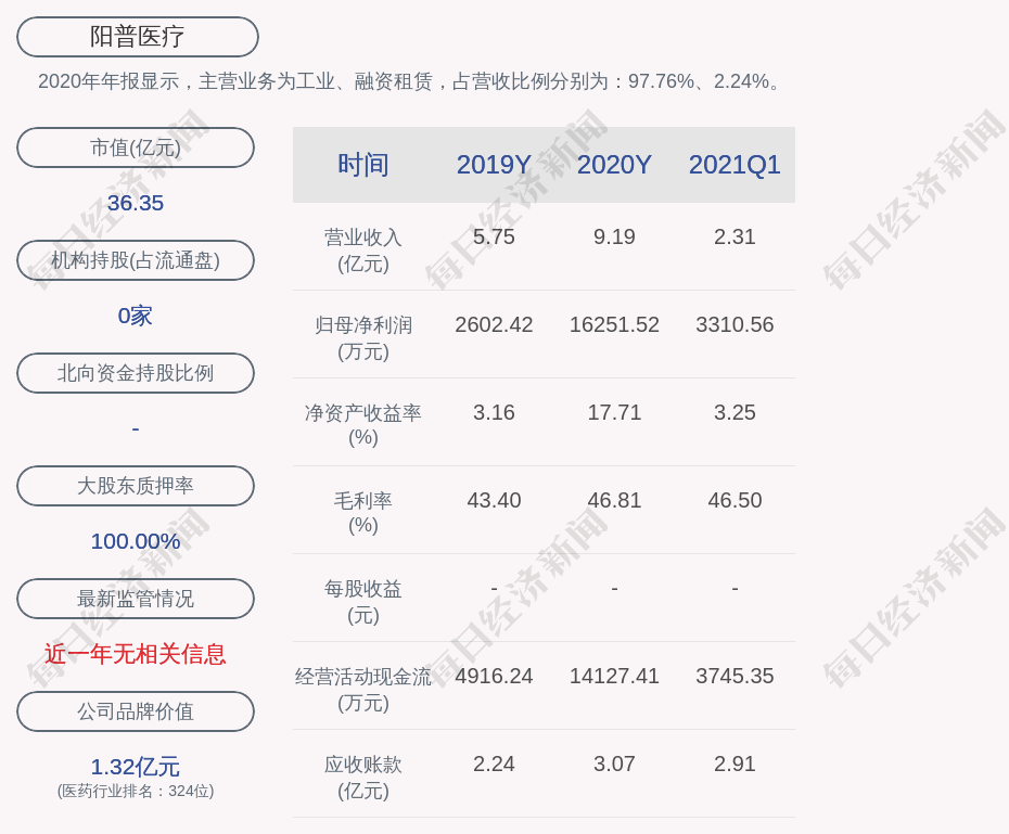 2020年年报显示,阳普医疗的主营业务为工业、融资租赁,占营收比例分别为:97.76%、2.24%。