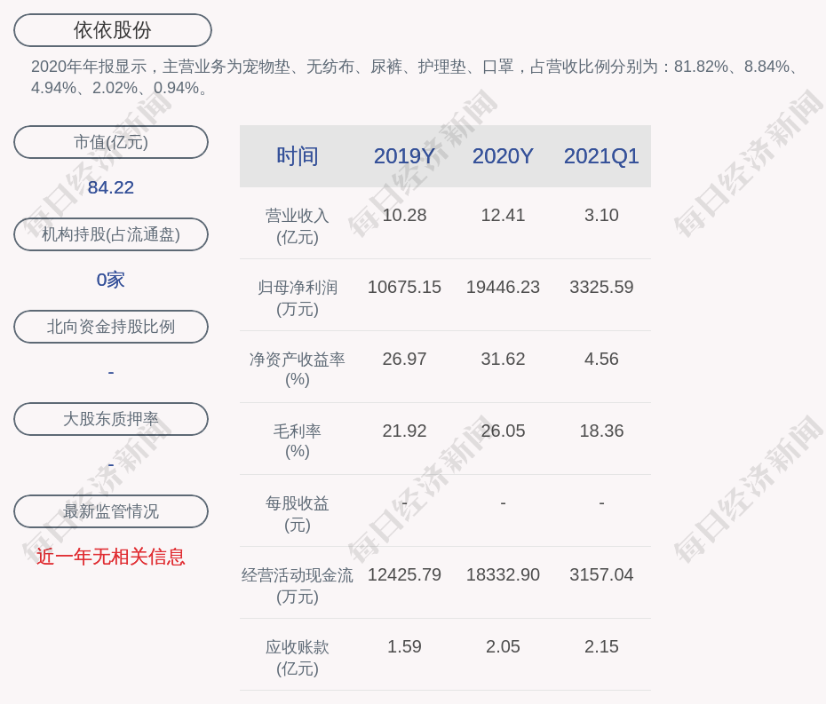 2020年年报显示,依依股份的主营业务为宠物垫、无纺布、尿裤、护理垫、口罩。