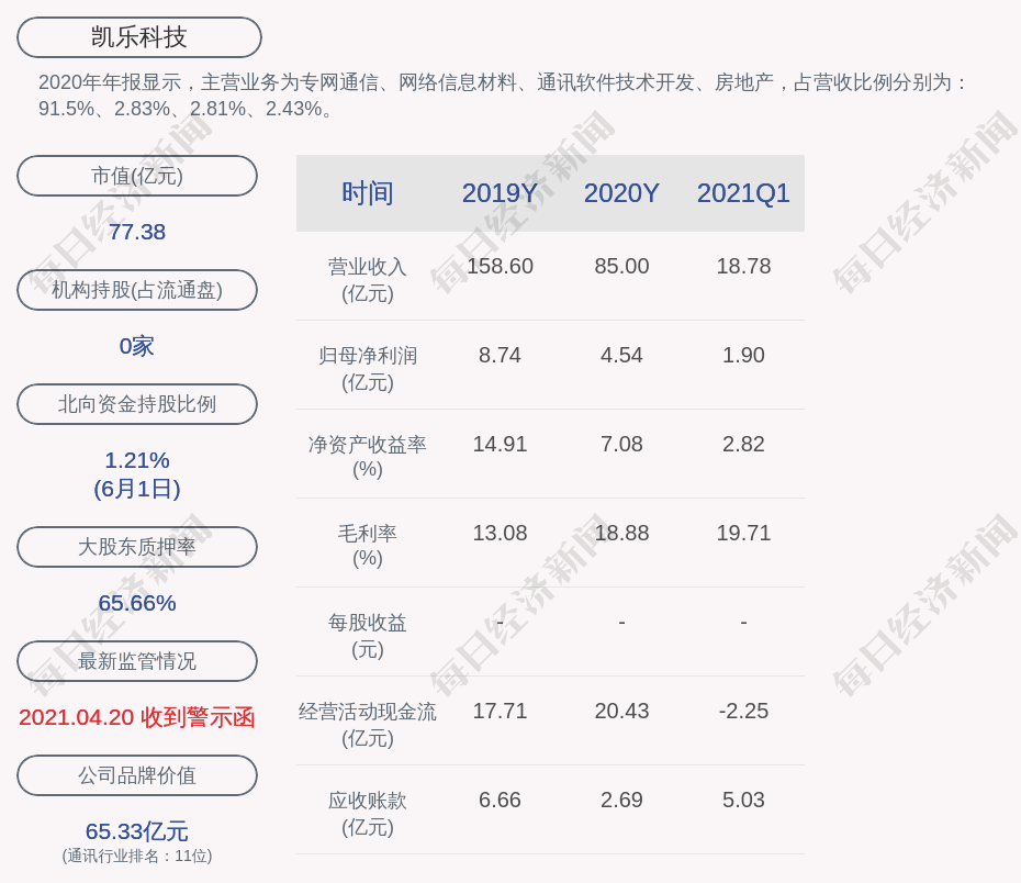 2020年年报显示,凯乐科技的主营业务为专网通信、网络信息材料、通讯软件技术开发、房地产,占营收比例分别为:91.5%、2.83%、2.81%、2.43%。
