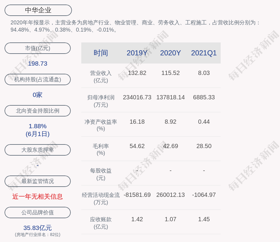 2020年年报显示,中华企业的主营业务为房地产行业、物业管理、商业、劳务收入、工程施工,占营收比例分别为:94.48%、4.97%、0.38%、0.19%、-0.01%。