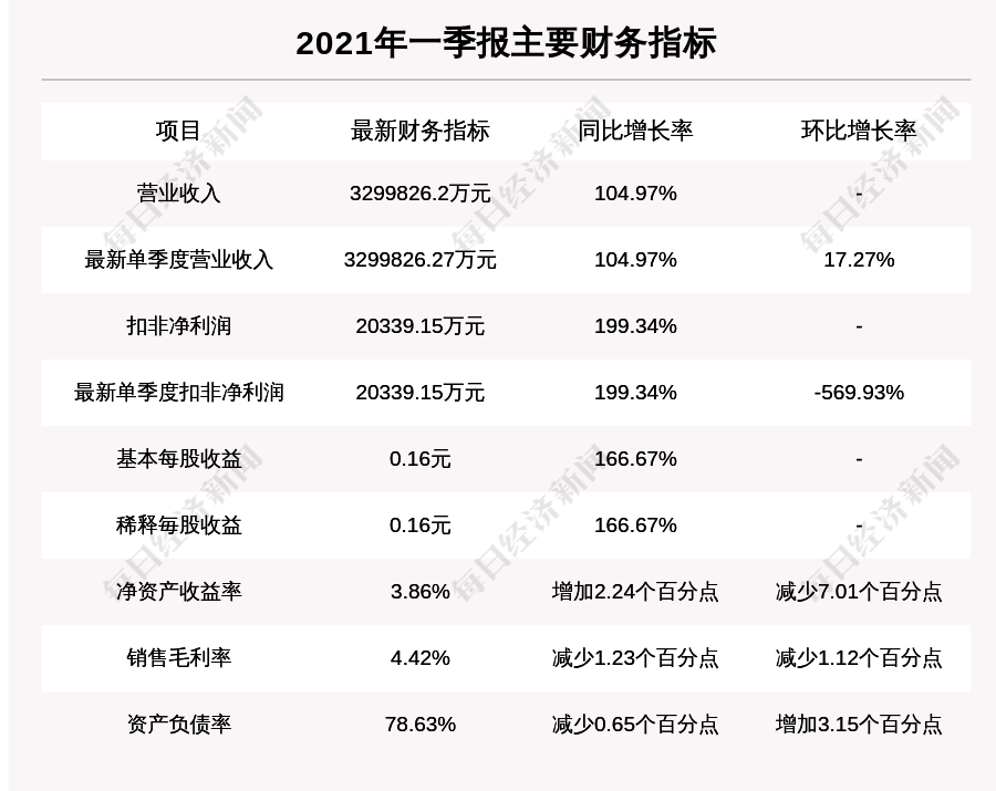 2.苏美达:2021年第一季度净利润约2.04亿元,同比增加179.79%