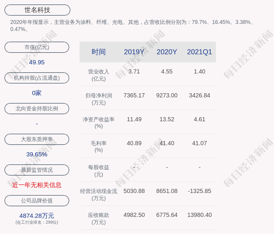 2020年年报显示,世名科技的主营业务为涂料、纤维、光电、其他,占营收比例分别为:79.7%、16.45%、3.38%、0.47%。