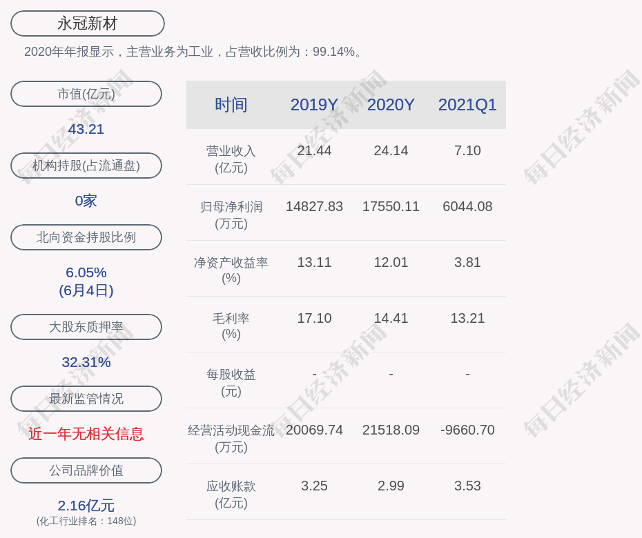 2020年年报显示,永冠新材的主营业务为工业,占营收比例为:99.14%。