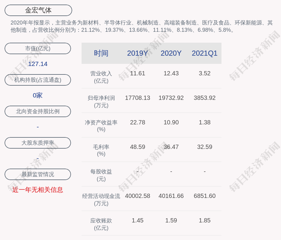 2020年年报显示,金宏气体的主营业务为新材料、半导体行业、机械制造、高端装备制造、医疗及食品、环保新能源、其他制造,占营收比例分别为:21.12%、19.37%、13.66%、11.11%、8.13%、6.98%、5.8%。