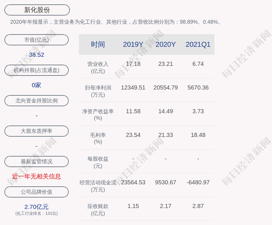 2020年年报显示,新化股份的主营业务为化工行业、其他行业,占营收比例分别为:98.89%、0.48%。
