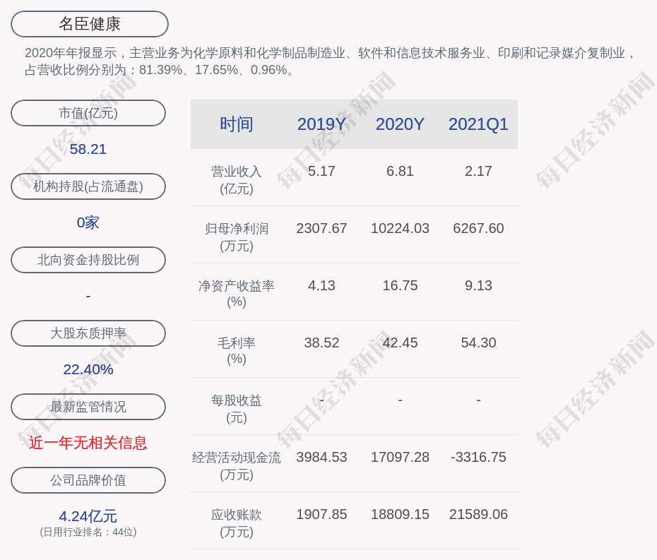 2020年年报显示,名臣健康的主营业务为化学原料和化学制品制造业、软件和信息技术服务业、印刷和记录媒介复制业,占营收比例分别为:81.39%、17.65%、0.96%。