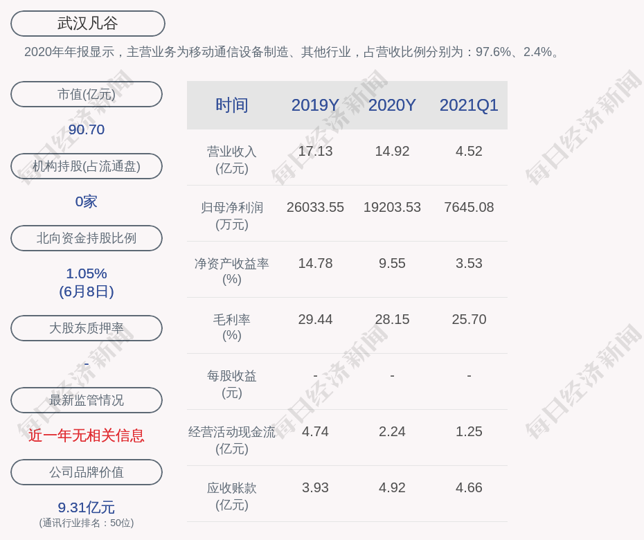 2020年年报显示,武汉凡谷的主营业务为移动通信设备制造、其他行业,占营收比例分别为:97.6%、2.4%。