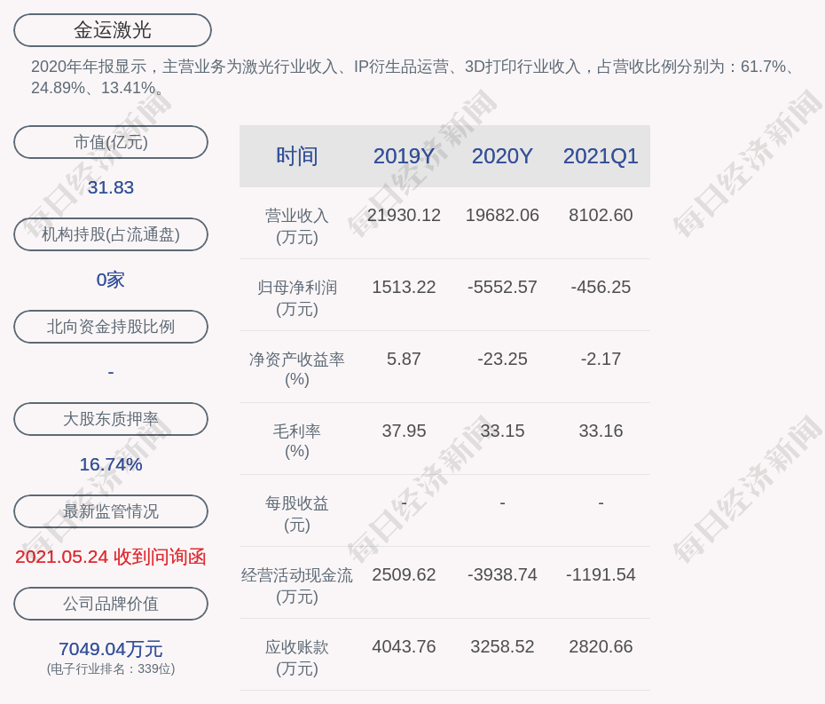 2020年年报显示,金运激光的主营业务为激光行业收入、IP衍生品运营、3D打印行业收入,占营收比例分别为:61.7%、24.89%、13.41%。