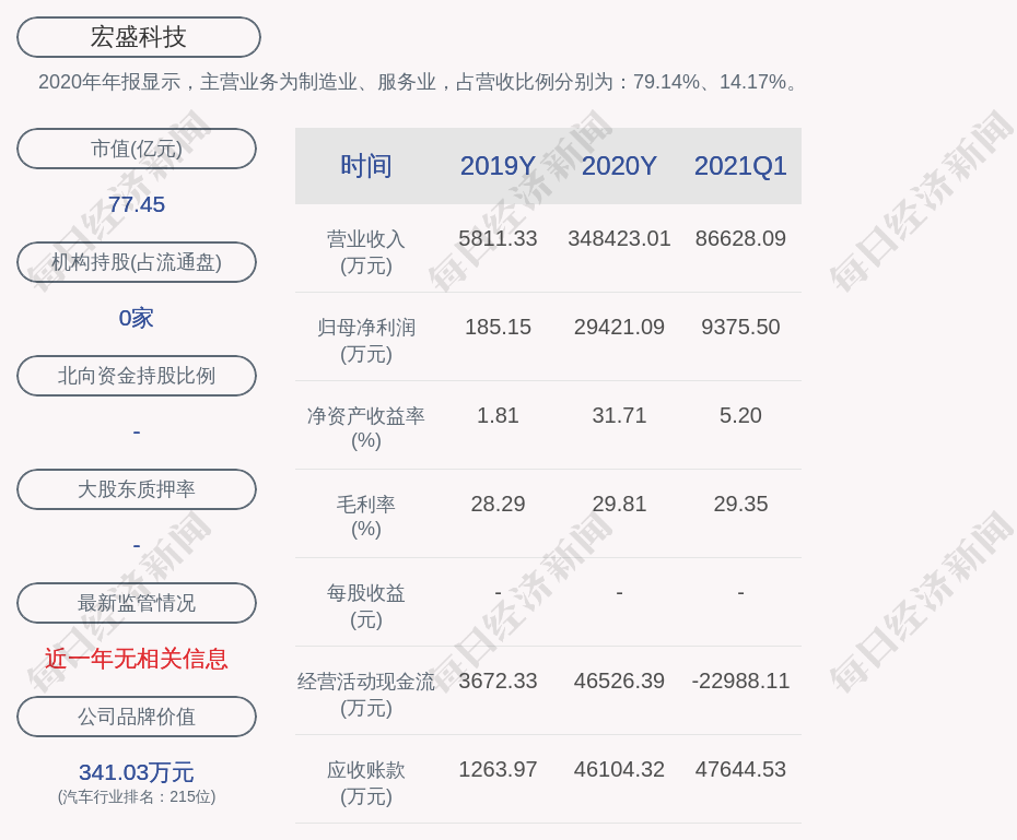 2020年年报显示,宏盛科技的主营业务为制造业、服务业,占营收比例分别为:79.14%、14.17%。