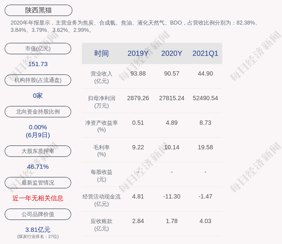 2020年年报显示,陕西黑猫的主营业务为焦炭、合成氨、焦油、液化天然气、BDO,占营收比例分别为:82.38%、3.84%、3.79%、3.62%、2.99%。
