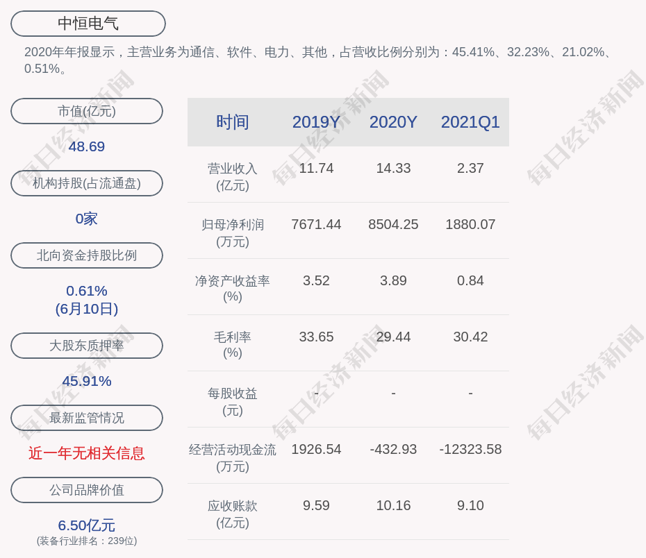 2020年年报显示,中恒电气的主营业务为通信、软件、电力等。
