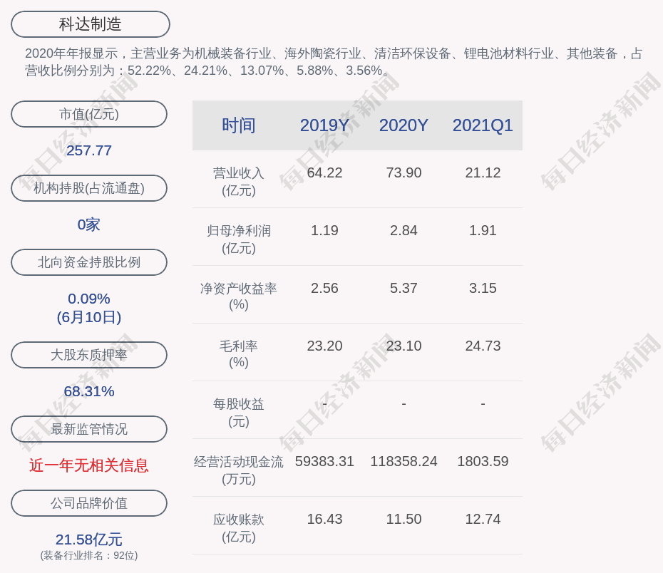 2020年年报显示,科达制造的主营业务为机械装备行业、海外陶瓷行业、清洁环保设备、锂电池材料行业、其他装备,占营收比例分别为:52.22%、24.21%、13.07%、5.88%、3.56%。