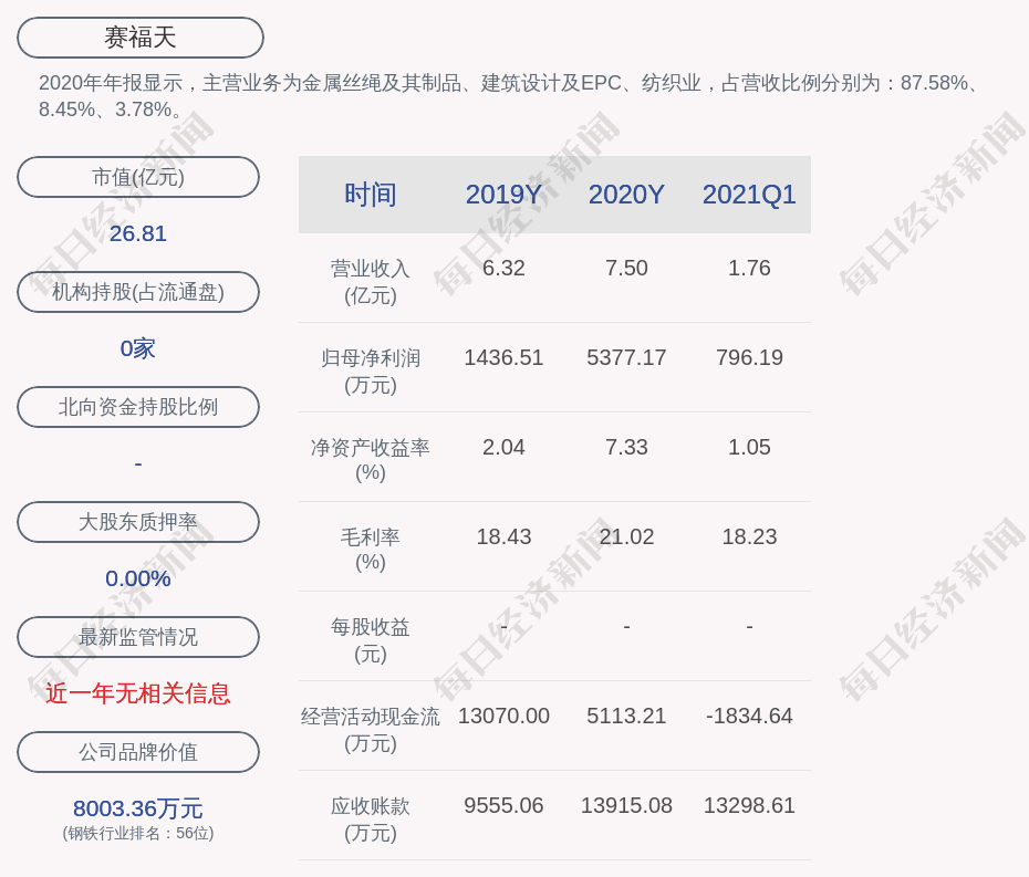 2020年年报显示,赛福天的主营业务为金属丝绳及其制品、建筑设计及EPC、纺织业。