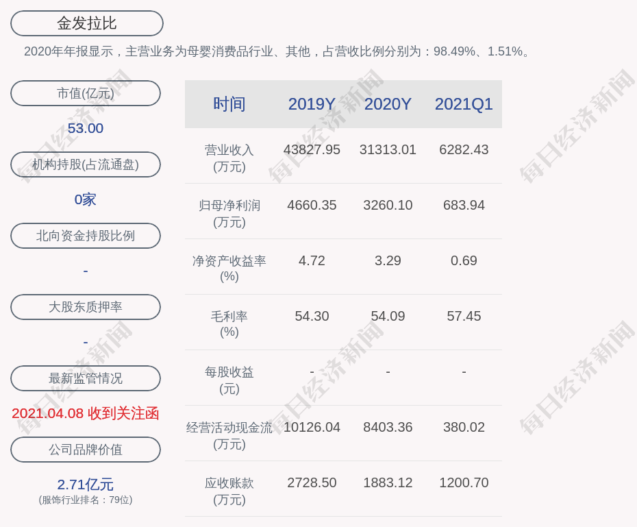 2020年年报显示,金发拉比的主营业务为母婴消费品行业、其他,占营收比例分别为:98.49%、1.51%。
