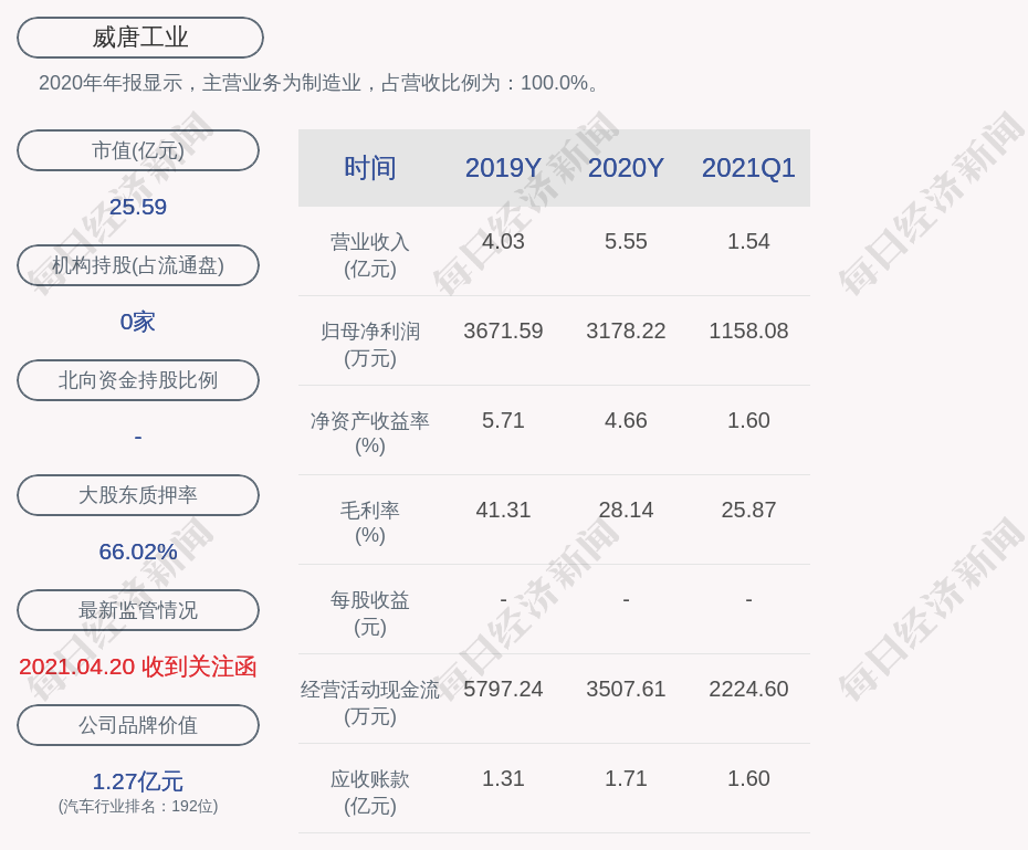 2020年年报显示,威唐工业的主营业务为制造业,占营收比例为:100.0%。