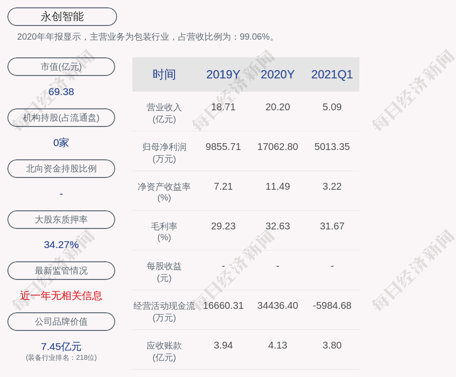2020年年报显示,永创智能的主营业务为包装行业,占营收比例为:99.06%。