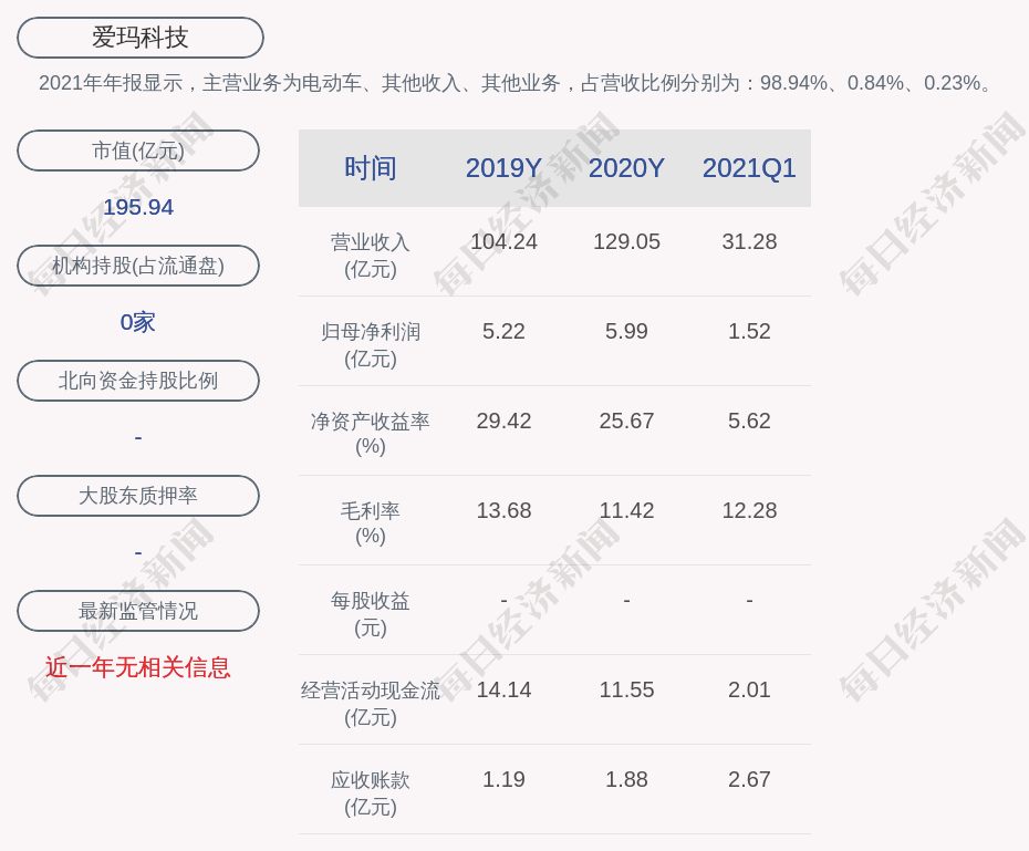 2021年年报显示,爱玛科技的主营业务为电动车、其他收入、其他业务,占营收比例分别为:98.94%、0.84%、0.23%。