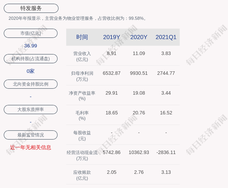 2020年年报显示,特发服务的主营业务为物业管理服务,占营收比例为:99.58%。
