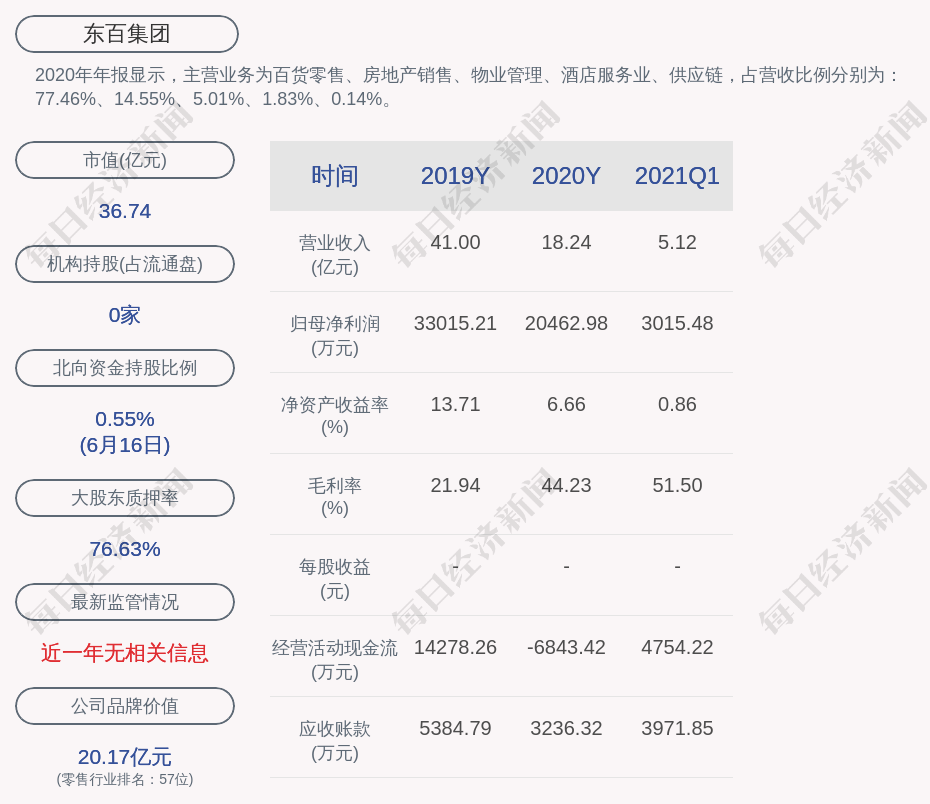2020年年报显示,东百集团的主营业务为百货零售、房地产销售、物业管理、酒店服务业、供应链,占营收比例分别为:77.46%、14.55%、5.01%、1.83%、0.14%。