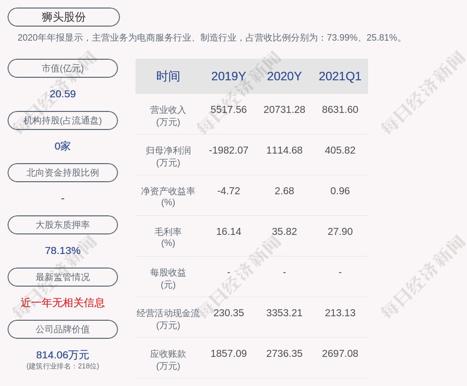 2020年年报显示,狮头股份的主营业务为电商服务行业、制造行业,占营收比例分别为:73.99%、25.81%。