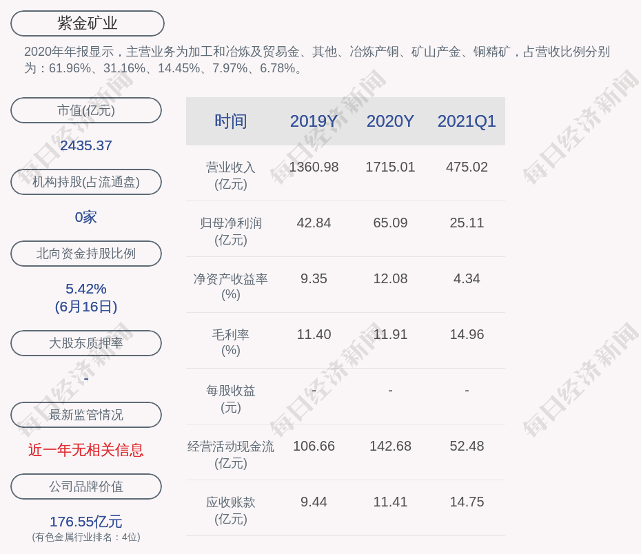 2020年年报显示,紫金矿业的主营业务为加工和冶炼及贸易金、其他、冶炼产铜、矿山产金、铜精矿,占营收比例分别为:61.96%、31.16%、14.45%、7.97%、6.78%。