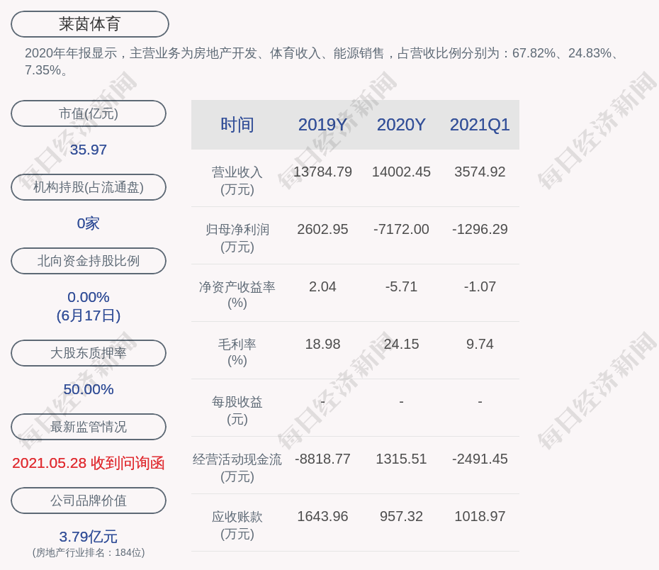 2020年年报显示,莱茵体育的主营业务为房地产开发、体育收入、能源销售。