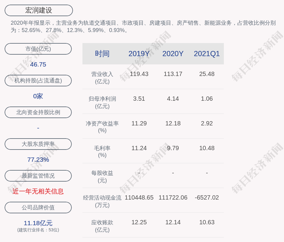 2020年年报显示,宏润建设的主营业务为轨道交通项目、市政项目、房建项目、房产销售、新能源业务,占营收比例分别为:52.65%、27.8%、12.3%、5.99%、0.93%。