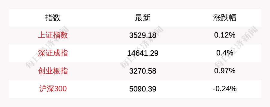每经AI快讯:北京时间6月21日15:00,上证指数收盘上涨4.08点,涨幅为0.12%,报收3529.18点,成交额4265.63亿元;深证成指收盘上涨57.62点,涨幅为0.4%,报收14641.29点,成交额5877.17亿元;创业板指收盘上涨31.35点,涨幅为0.97%,报收3270.58点,成交额2376.08亿元;沪深300收盘下跌12.08点,跌幅为0.24%,报收5090.39点,成交额3315.27亿元。北上资金当日净流出20.09亿元。