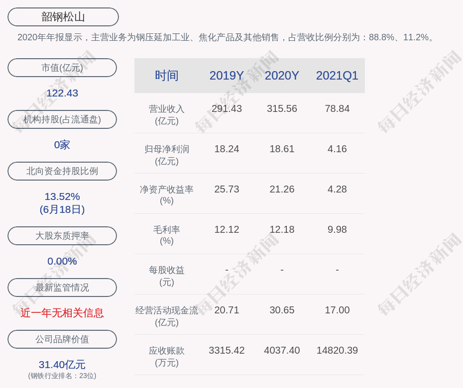 2020年年报显示,韶钢松山的主营业务为钢压延加工业、焦化产品及其他销售,占营收比例分别为:88.8%、11.2%。