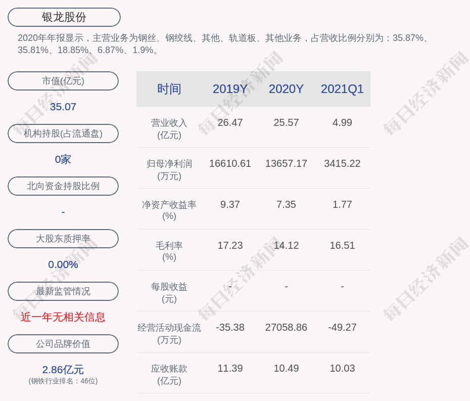 2020年年报显示,银龙股份的主营业务为钢丝、钢绞线、其他、轨道板、其他业务,占营收比例分别为:35.87%、35.81%、18.85%、6.87%、1.9%。