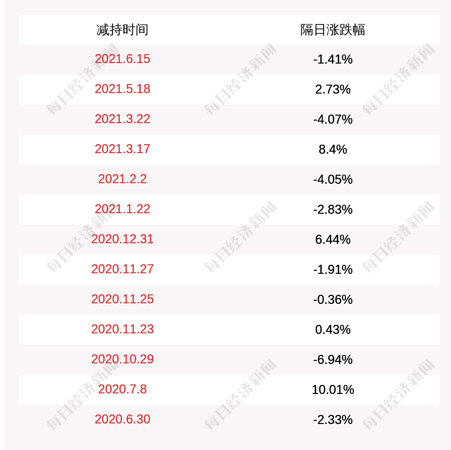 2. 怡达股份上次发布减持公告是2021年06月15日,第二个交易日下跌1.41%,怡达股份近一年共发布14次减持类公告。更多关键信息,请搜索“道达号”。