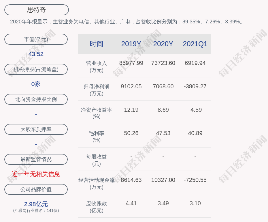 2020年年报显示,思特奇的主营业务为电信、其他行业、广电,占营收比例分别为:89.35%、7.26%、3.39%。