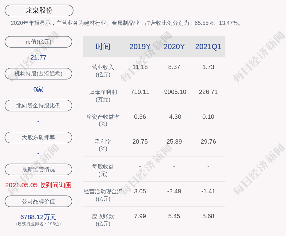 2020年年报显示,龙泉股份的主营业务为建材行业、金属制品业,占营收比例分别为:85.55%、13.47%。