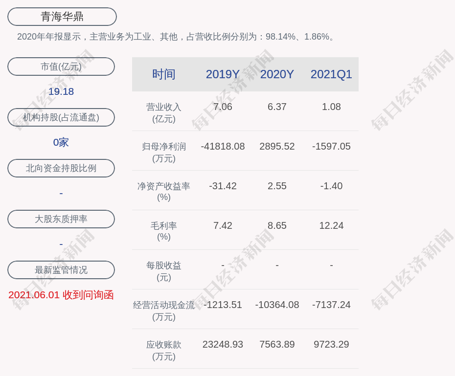 2020年年报显示,青海华鼎的主营业务为工业、其他,占营收比例分别为:98.14%、1.86%。