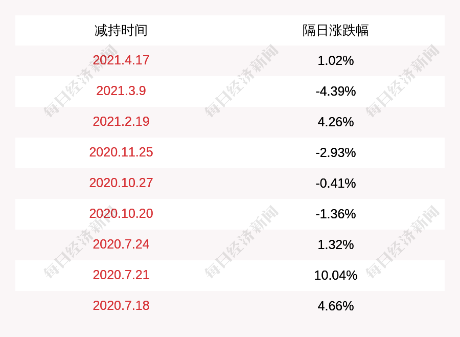 3. ST花王上次发布减持公告是2021年04月17日,第二个交易日上涨1.02%,ST花王近一年共发布10次减持类公告。更多关键信息,请搜索“道达号”。